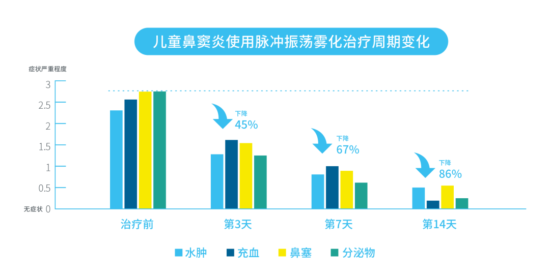使用脉冲振荡雾化,治疗周期较普通鼻喷剂缩短50%,等于让患者暴露在药物下的周期也大大缩短。