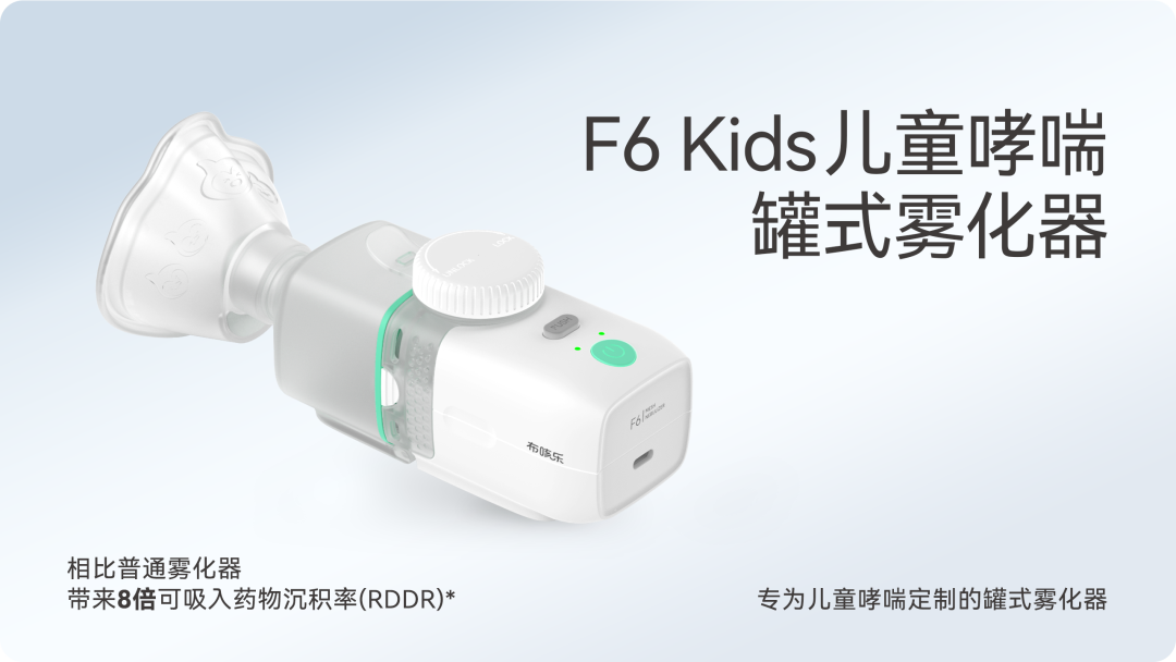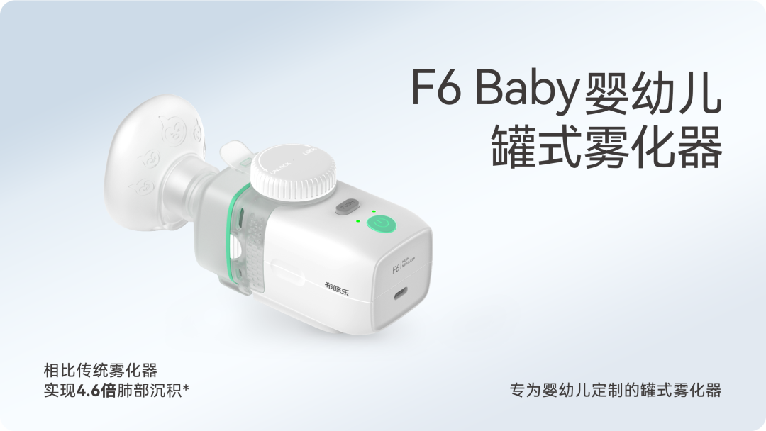 F6系列今冬即将上市,以更高递送率与肺部沉积量、更高安全性、更多人性化设计,守护孩子呼吸健康。关注布咳乐公众号,第一时间了解F6上市动态。